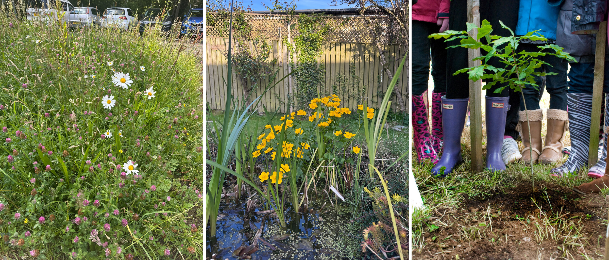 Car park verge that is taking part in Let It Bloom June, a small urban pond, tree planting and other nature-linked events can be very rewarding.